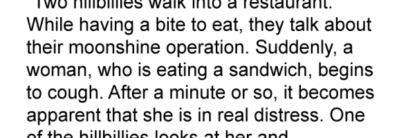 Two hillbillies walk into a restaurant. While having a bite to eat, they talk about their moonshine operation.