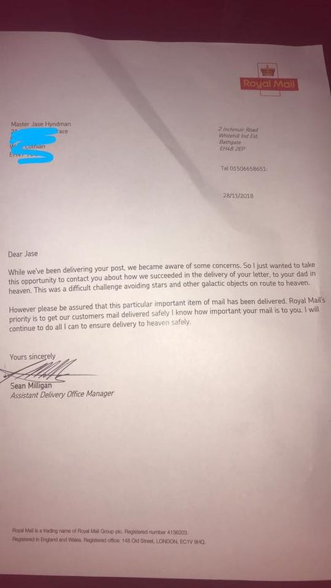 Sean Milligan, who is the Assistant Delivery Office Manager for the Royal Mail, continues in his letter by saying, “So, I just wanted to take this opportunity to contact you about how we succeeded in the delivery of your letter, to your dad in Heaven. This was a difficult challenge avoiding stars and other galactic objects en route to Heaven.”