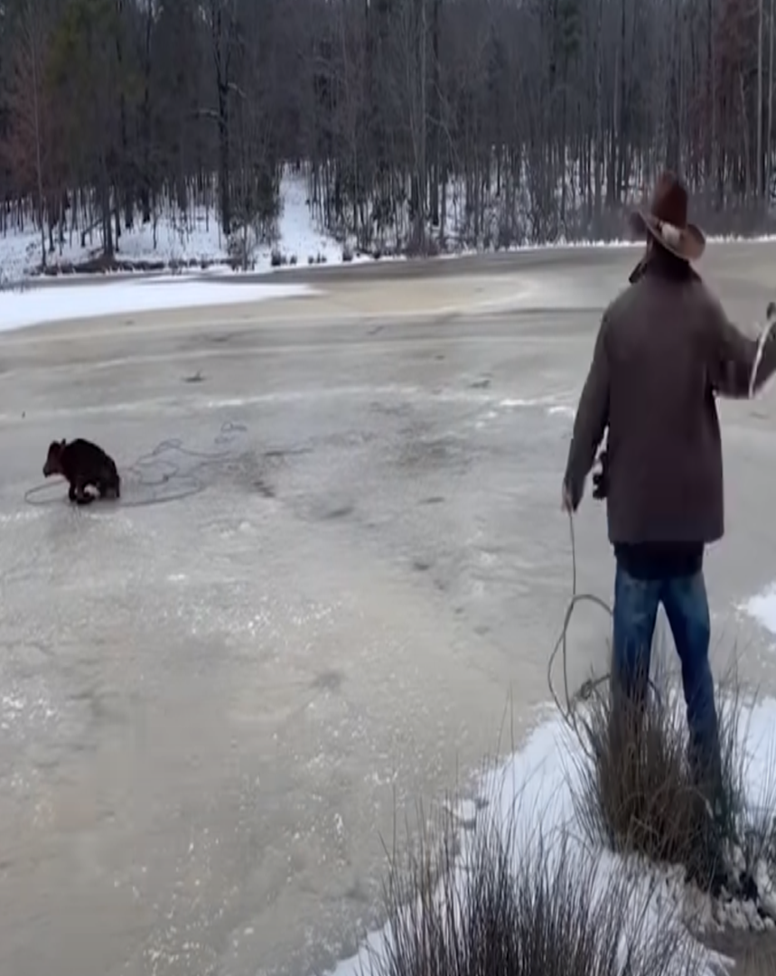 We see a character trying to use a rope to rescue a calf stuck in a frozen lake. The ice was in great danger of collapsing under his weight, prompting the man to act quickly.