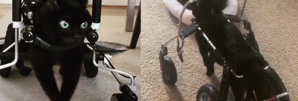 A cute cat with brain hypoplasia fully enjoys life thanks to its beloved owner.