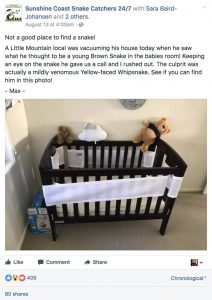 Sunshine Coast Snake Catchers shared the above photo to their Facebook page, showing a baby’s nursery with a very unwelcome guest.
