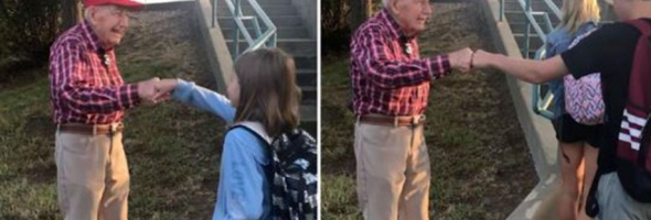 Wally greets the students with beaming smiles and inspirational sentiments. After dispensing his wisdom, he says goodbye with friendly handshakes and fist bumps. His goal is to spread kindness and positivity to students on their way to school.