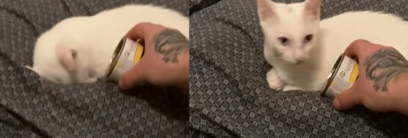 Jindra said, “Rosie was asleep and it was time to eat, so we went to visit Rosie, but she was asleep, so when I put canned food in her nose, she woke up and jumped up.