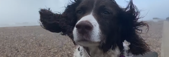 This brave dog was caught on February 18, 2022 during a strong Eunice wind storm. Darren Yates, 46, took 9-year-old Millie Springer Spaniel to Goring Beach in Worthing, West Sussex, England during Hurricane Eunice.