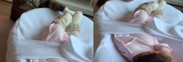 The video was made on January 22 this year in St. Petersburg, Russia, and we can see a wonderful cat’s reaction when she first saw a newborn baby in front of her.