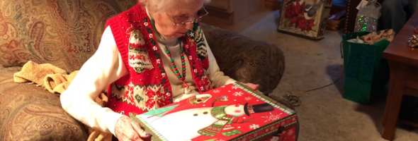 One of the family members hands grandma a heavy box. Grandma has no idea what the box contains. She carefully holds the box in her lap and removes the lid. For a moment, she is taken aback. Something squeals from the box causing her to jump.