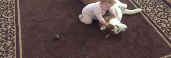 The heart-melting clip below features a 7-months-old baby spending some time with a baby. The Siberian husky is embraced by baby in an adorable way. Since the dog know he is interacting is a little baby, he becomes playful, but does everything in a soft way.