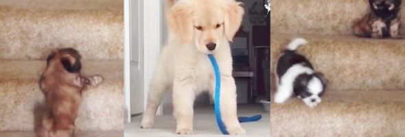 These adorable puppies all have one thing in common, they are trying to conquer the stairs. Each one of them slowly but surely attempts to walk down the stairs successfully.