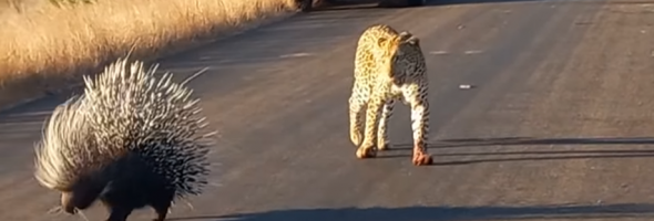 A strange battle, which lasted half an hour, forced the determined leopard to take a break several times to pin his paws and lick his wounds, while the brave porcupine remained by his side, as if mocking his opponent.