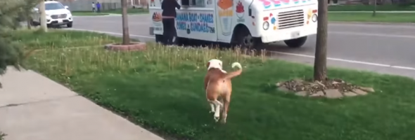 Dogs are curious creatures but the best friends you can ever have. This dog was playing outside when it heard the famous ice cream truck. Just like any hungry child could do, the pit bull ran to the truck.