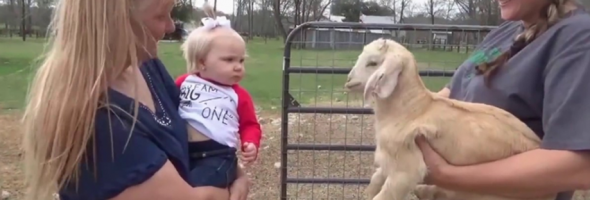 Mom and baby girl walk up to goat. The “conversation” that ensues left everyone in stitches