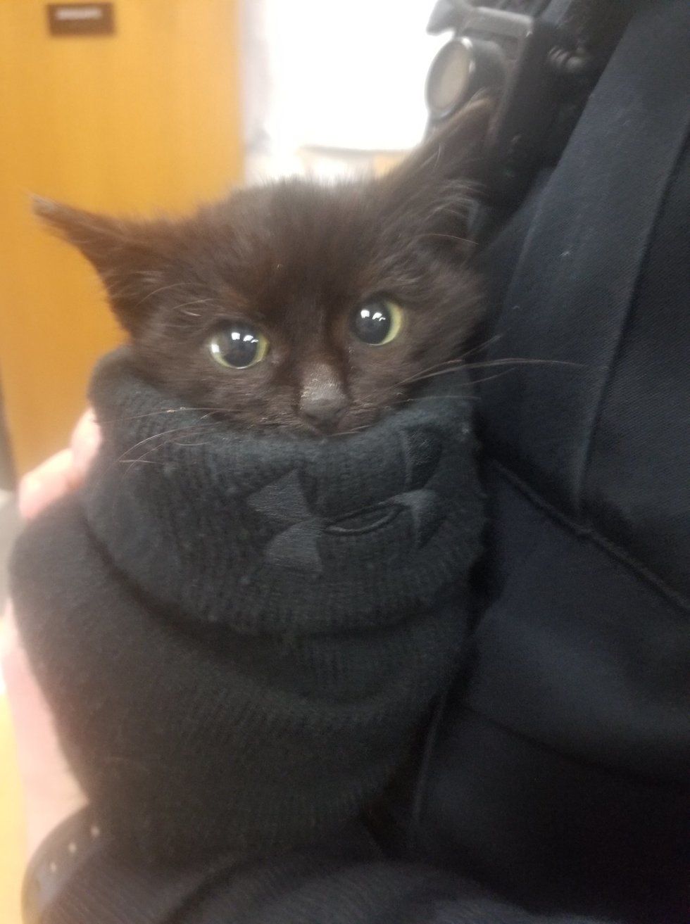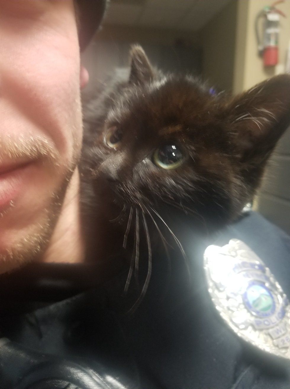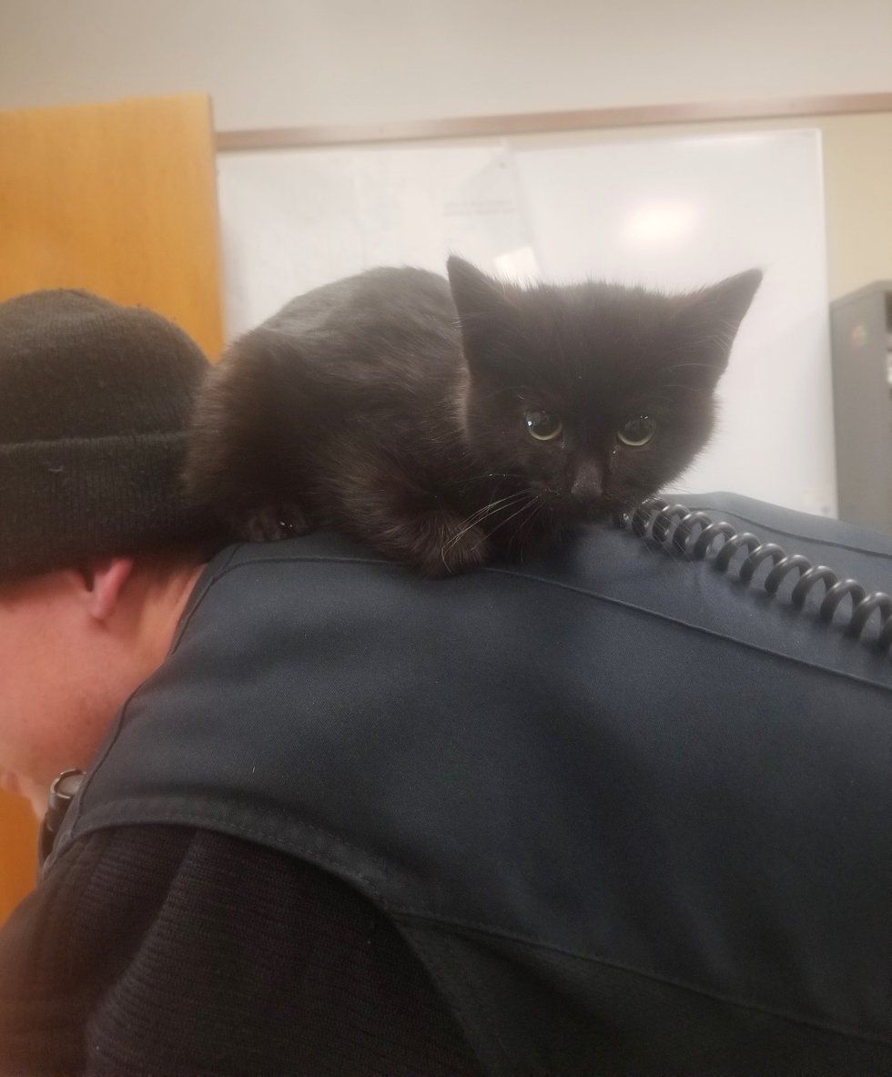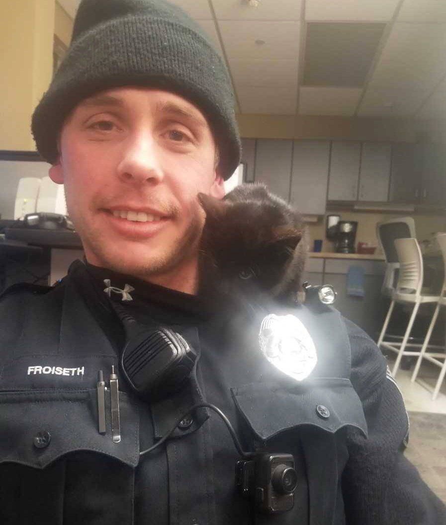 It was a tiny black kitten with a pair of big eyes piercing through the darkness while he was pleading for help. Froiseth sprang into action — he carefully shuffled through the snow and removed the rocks. Once he got the kitten safely in his arms, he headed back to his squad car to get the little one warmed up.