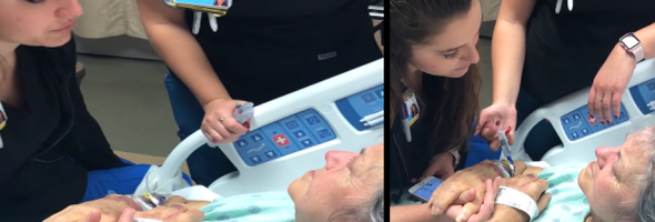 63-year-old patient Margaret Smith identified nurse Olivia Neufelder as her angel. The nurse treid to bring a smile on her face in the video by singing the song “Dancing in the Sky”, originally performed by the music group Dani and Lizzy.