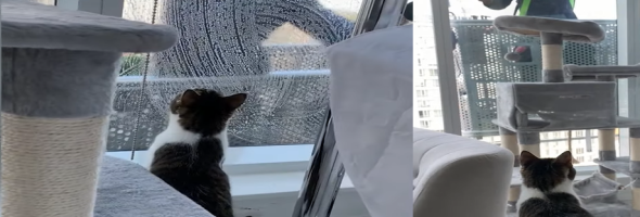 A wonderful friendship developed between the cat and the local window cleaner. Daniela Morales, a 30-year-old marketer, saw the lucrative relationship between her eleven month old cat, Scooter and an unknown window cleaner maker as she played for five minutes across the street from her 22-story Toronto apartment building.