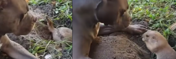 Pitbull’s dog found a gopher in a hole in the fence, and the animals quickly became friends.