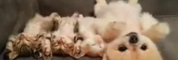This is one of the most adorable scenes you have likely ever come across. This video features a sweet dog who is lying on his back with three tiny kittens who are lying on theirs. They have fallen asleep and he is lying super still because he does not want to wake them up. It is so cute to see him lying there with his eyes open, barely even breathing because he does not want to disturb his friends.