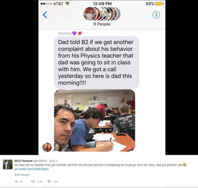 Brad’s sister, Molli, texted a photo of her dad sitting next to Brad as he did what he was supposed to be doing in class: studying. The text turned into a tweet that thousands of people have liked