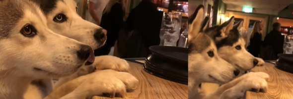 Check out this cute video where you can watch two huskies eat at a bar. Thanks to the bartender for such care and kind gesture.