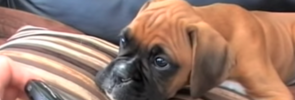 This little Boxer named Harvey is very sad because Mom has gone to work and didn’t take him with her. He just sits on the couch with this sad face on and waits for Mom to come home again. But Dad can’t stand to see the little puppy so sad, so he decides to do something about it.