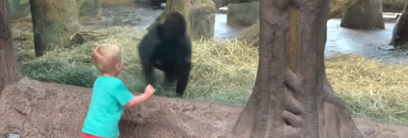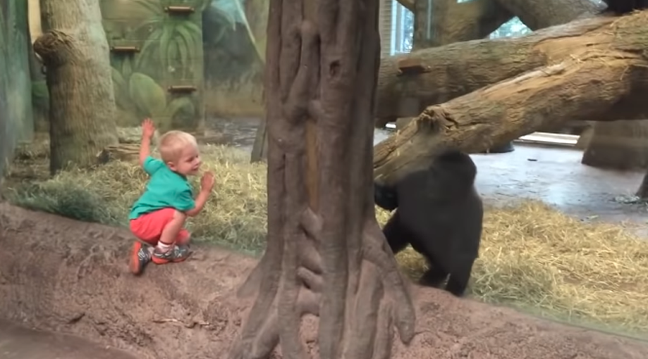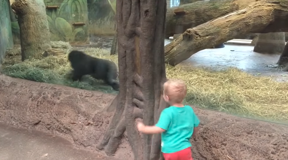 The video starts off by showing a child at the zoo looking into the gorilla’s living quarter. The toddler is trying to get the animal’s attention and is being playful. As soon as the boy gets close enough to the glass, the gorilla springs into action and starts an adorable game of peek-a-boo. Who doesn’t like peek-a-boo? I knew that kids always get a laugh out of it, but I can now see that even animals find the game entertaining.